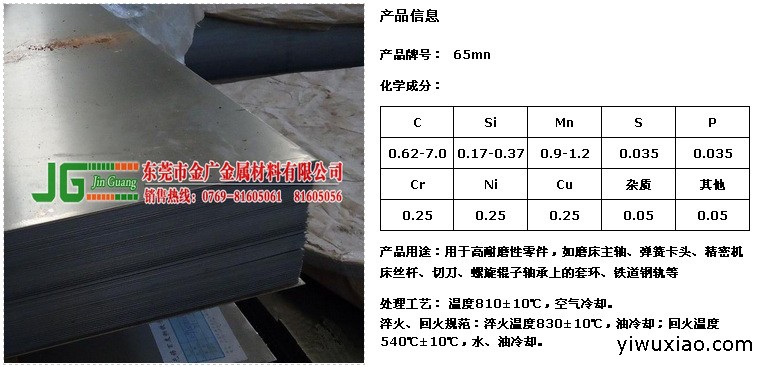 70MnMn-特性:特性及适用范围:65mn弹簧钢,是锰提高淬透性,φ12mm的钢材油中可以淬透,表面脱碳倾向比硅钢小,经热处理后的综合力学性能优于碳钢,但有过热敏感性和回火脆性。用作小尺寸各种扁、圆弹簧、座垫弹簧、弹簧发条,也可制作弹簧环、气门簧、离合器簧片、刹车弹簧及冷拔钢丝冷卷螺旋弹簧金广公司介绍:订购流程: