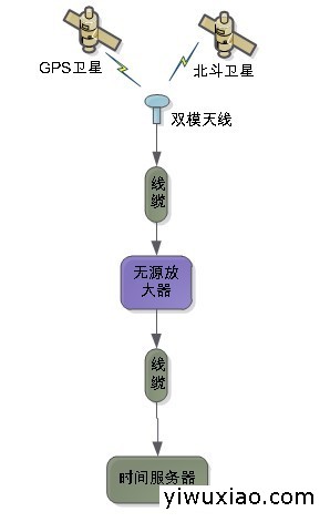 GPS/北斗双模天线接收GPS/北斗卫星的无线电信号,天线的信号强度为45db,经过50米-7的传输线缆,大概衰减22dB,目前就剩23db的信号强度,再经过低噪声放大器,使其信号再增强26db,就变成49db了,再经过50米 -7线缆的传输就剩27db信号强度。时间服务器的最佳接收强度是27db左右,这样的强度送给时间服务器是没问题的,完全符合接收机对信号强度的要求。