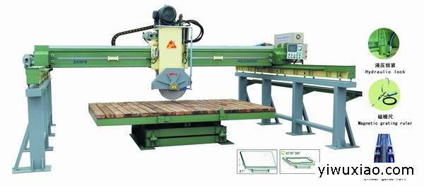 红外线桥式自动石材切割机械采用优质钢材制造,直线导轨副导向传动,磁栅尺测量、激光划线仪对刀,工作台做360º旋转并可翻板,PLC控制,全自动位移定位,加工板材规格大、精度与效率高的特点。锯片直径范围 Ф400mm ~ Ф700mm切割板材规格 3200*2200 mm最大横向行程 3600mm最大纵向行程 3300mm 锯片升降行程 430mm设备外形尺寸 5850×4800×3200mm安装锯片数量 1张工作台最大翻转角度 87°工作台最大旄转角度 360°工作台定位角度 0°- 45°- 90°主电机功率 18.5kw