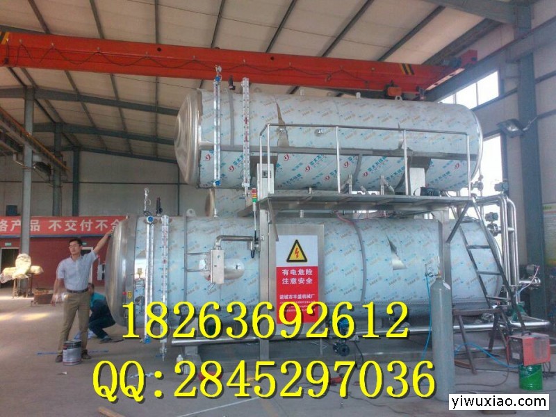 立式杀菌锅加热介质为混合的水喷雾、蒸汽和空气。冷却水在杀菌循环结束时引入杀菌锅。在水喷雾杀菌锅中也可以使用其它的水加热和循环方法。另外一种类型的系统是使用位于杀菌锅顶部的水分布系统,对水加热或冷却,从上而下对容器进行喷淋。空气作为过压源。水通过外部的热交换器进行加热,并在此系统中用泵进行循环。当杀菌完成后,杀菌热水通过外部的热交换器进行冷却,作为冷却水。杀菌锅以有一定的压力的蒸汽为热源,具有受热面积大,热效率高、加热均匀、液料沸腾时间短、加热温度容易控制等特点。本锅内层锅体(内锅)采用耐酸耐热的奥氏型不锈钢制造,配有压力表和安全阀,外型美观、安装容易、操作方便、安全可靠