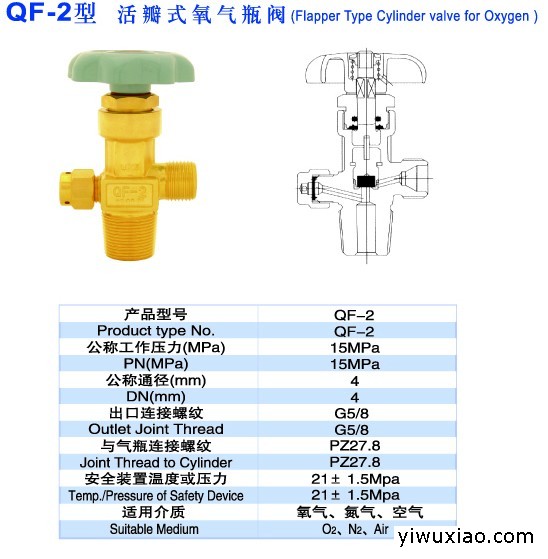 产品型号QF-2型。公称工作压力15Mpa。公称通径4mm。进口连接螺纹G5/8.于气瓶连接螺纹PZ27.8。适用于氧气,氮气,空气。
