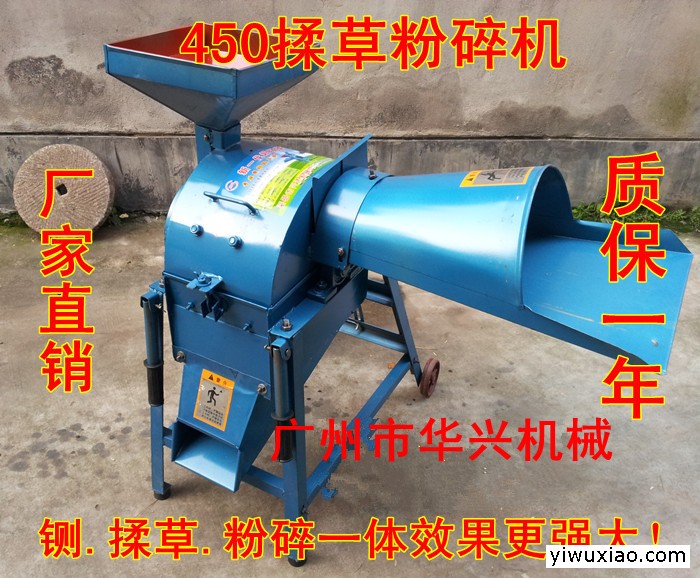 广州市华兴机械的450型的功能饲草粉碎机佩戴飞轮,当主轴转速达到每分转1500转时,飞轮可储存足够大的能量帮助较小的动力(如单相3千瓦的电动机)完成正常的铡草、粉碎工作。