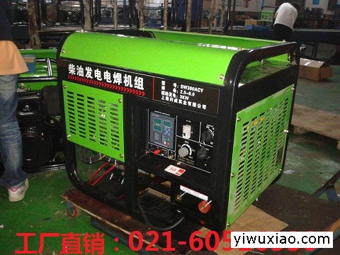 【公司名称】:上海闪威实业有限公司【闪威经理】:康军【联系电话】:固定021-60516330 移动13585557197 QQ:845868686【电子邮箱】:845868686@qq.com【设备网址】:http://www.swfadianji.com 【公司地址】:上海市嘉定区宝钱公路5000弄169号 300A柴油发电电焊机最新技术参数设备品名: 300A柴油发电电焊机型号: SW300ACY电焊机配置:电流调节范围: 50-300A空载电压: 50V工作电压: 25-33V负载率: 100%焊条: 2.5-6.0发电机配置:额定功率: 10KW后备功率: 12.5KW电压: 220V/380V频率: 50HZ直流输出: 12V/8.3A功率因数: 1(cosΦ)相数: 单相、三相励磁方式: AVR绝缘等级: F级动力配置:动力型号: SW2V870动力缸径: 2-86*72mm缸数: 双缸排量: 870CC冷却方式: 风冷启动方式: 手启动/电启动机油容积: 1.7L主燃料: 柴油机组参数油箱容积: 30L连续工作时间: 满载12小时供油方式: 自流式整机尺寸: 860*630*720(mm)整机重量: 180KG整机机组组成部分: 柴油机 发电机 电焊机 氩弧焊 油箱整机设备随机附件: 配置自带四个轮子和手推把、电启动钥匙三把、三年易损配件、合格证、售后维修卡、电瓶及连接线、安装小工具包、详细使用说明书各壹套、焊接插头两个、发电输出插头三个。