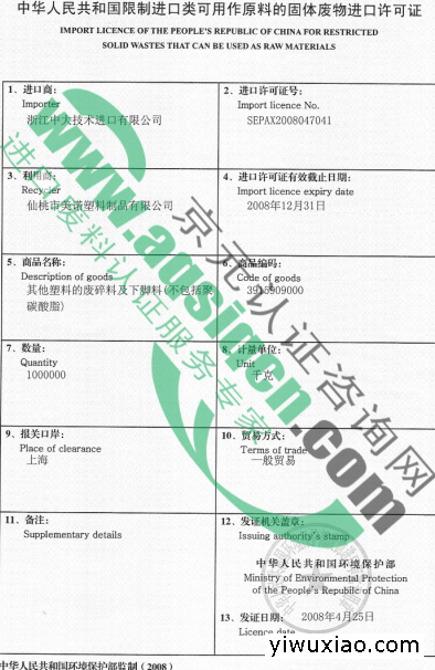 固体废料进口许可证资料单一、书面申请报告。二、申请表。三、环境保护报告。2011年6月1日以后首次申请进口可用作原料的固体废物的加工利用企业应提供企业环境保护报告。四、符合环境保护要求的证明材料,包括:1、省级环境保护行政主管部门根据县级以上地方环境保护行政主管部门的监督管理情况,出具的对加工利用企业监督管理情况表,或者对加工利用企业监督管理情况及初审意见表。2、加工利用企业年检有效的法人营业执照副本、组织机构代码证书副本、一般纳税人资格证书(或者加盖“增值税一般纳税人”字样的国税税务登记证)的复印件。3、申请表填报的场地(包括厂区入口及厂牌、厂区概览、原料和成品贮存场地、加工利用场地)、设施、设备、污染防治设施设备的彩色照片及文字说明。4、加工利用企业建设项目环境影响评价文件及其批准文件和项目竣工环境保护验收批准文件的复印件;需要进口固体废物试生产的企业,应当提供试生产批准文件的复印件。5、有关经营情况记录簿样本、环境监测等环境管理制度文本,以及相关防止进口不符合国家环境保护控制标准的固体废物的管理制度和措施。加工利用企业经营情况记录簿,应如实记载每批进口固体废物所使用的许可证号、报关日期、进口金额、进口口岸、进口数量,到厂日期和数量,运输单位的名称和联系方式;加工处理或者利用进口废物量、时间、产品产量和流向;进口固体废物中夹杂物(定义见《进口可用作原料的固体废物环境保护控制标准》)以及生产过程中产生的固体废物的名称、数量及利用和处置情况;进口固体废物中夹杂物和生产过程中产生的固体废物的记录应当分别填写,确实难以区分的,应当说明理由;上述记录应当由经办人签字。有关固体废物进口、运输,产品销售,进口固体废物中的夹杂物和生产过程中产生的固体废物利用处置等环节的原始凭证,如合同、付款单据、发票、纳税申报表、税收缴款书(完税凭证)等,应作为经营情况记录簿的附件保存备查,保存期为2年。环境监测方案应确定监测指标和频率,以及应急监测预案,其中特征污染物应当每季度至少监测一次;实行“圈区管理”的区内加工利用企业,特征污染物应当每六个月至少监测一次。进口固体废物加工利用企业应当自行监测或委托监测;自行监测的,应当出具监测资质证明和持证上岗证,制定监测仪器的维护和标定方案,定期维护,标定并记录结果;委托监测的,应当提供委托合同和委托监测机构的监测资质证明文件。 本单位有关环境保护岗位职责与考核标准的规章制度;相关工作人员和管理人员的环保培训材料等。 依据《清洁生产促进法》第二十八条和《清洁生产审核暂行办法》(国家发展改革委、原国家环境保护总局)令第16号)第八条,应当实施强制性清洁生产审核的企业,应提供通过清洁生产审核评估验收的证明文件的复印件,若尚未进行评估验收,则提供清洁生产审核报告、向环保部门递交的评估验收申请及回执的复印件。6、加工利用企业自营进口的,应当提供加工利用企业有效的进口可用作原料的固体废物国内收货人注册登记证书、进出口货物收发货人报关注册登记证书的复印件。委托其他企业代理进口的,提供代理进口企业年检有效的工商营业执照副本、组织机构代码证书副本、进口可用作原料的固体废物国内收货人注册登记证书、进出口货物收发货人报关注册登记证书以及代理进口合同的复印件。代理进口合同中,应当订明以下条款:1.有关进口固体废物的种类、数量、价格和质量要求;2.有关进口固体废物必须符合我国进口固体废物环境保护控制标准,以及对不符合环境保护控制标准固体废物退运责任的规定;3.有关不得将所进口固体废物弃货以及不得转让固体废物进口许可证的规定。申请以加工贸易方式进口固体废物的,提供商务主管部门签发的有效的加工贸易业务批准文件复印件或者所处出口加工区管理机构出具的加工贸易业务证明。北京市京元物环认证咨询有限公司杭州市江干区秋涛北路77号新城市广场A座10层10F,A Building New City Square ,Qiu tao North Street,Jiang gan District,Hangzhou ,China 310020网站 (WEB) :www.aqsiqcn.com联系人:孙小姐固话(TEL:)0571-56757878手机(MOB):18657137360MSN:candiceAQSIQ@hotmail.com QQ:2851637217