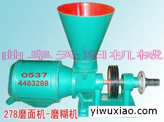 原粮磨面机(磨粉机,磨糊机,磨浆机)具有结构简单、加工和安装工艺性好,体积小,噪音轻、操作使用方便,不易产生过扭矩或粘结面粉等优点,由进料、锥形磨和分离系统组成,磨面机的内、外磨头下端的配合面呈圆锥形,磨头的上方由两个向心球轴承作为两个主支承点,内、外磨头下端的圆柱作为旋转辅助支承点,并由内磨头的轴向移动调整内、外磨头的间隙。磨碎的粮食直接从磨头间隙经罗架落到罗底上,由可调整间隙的刷子与罗底将面粉与麸子(种皮)分离开。原粮磨面机集粉碎、磨面、磨糊,磨浆、饲料加工于一体,能将小麦、大米、小米、玉米、黄豆、芝麻、大豆、高梁、青稞等粮食类,以及其它部份化工原料,软质石,木粒物料等干磨制成粉,加水和磨成浆(糊),物料加工粗细可以调整,适于农村和小型化粮食、饲料加工作业。型号:TY-278,加工量:500-600公斤/小时,动力7.5KW,价格2780元。联系人:王杰电话:0537-4483288 13181307932 QQ:2536471247地址:曲阜市外贸大厦三楼(归德南路一号) 网址:www.sdtianyang.com