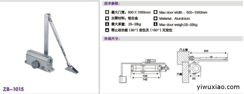 2.双弹簧闭门器最大门重为45-65kg;
