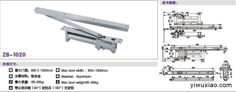2.双弹簧闭门器最大门重为45-65kg;