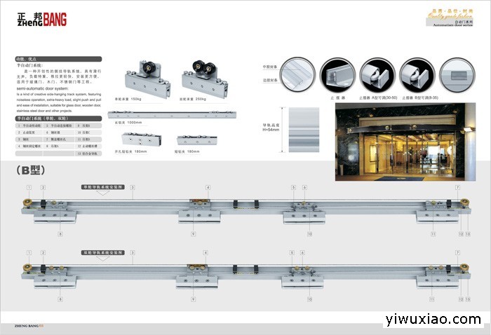 半自动门功能 一种半自动推拉门,包括门框,可在门框的上、下导轨内滑行的门扇,其构造的特点是门扇一侧竖设有导管,导管上端设有滑轮,一根绳索绕过滑轮将垂重器悬吊于导管内,其另一端与位于门扇另一侧上导轨上的固定块相联接。当推开门扇时,垂重器沿导管上行;当开门的推力消失,垂重器的自重力经绕过滑轮的绳索迫使门扇自动滑回原处。 本导轨系统是一种开创性的侧挂导轨系统,具有滑行无声,负载特重,推拉更轻快,安装更方便,适用于玻璃门、木门、不锈钢门等工程。半自动门系列(单轮,双轮): 1、半自动传动轮 2、钢丝锁 3、钢丝固定螺丝 4、止动装置 5、钢丝固定螺丝 6、侧盖螺丝孔 7、钢丝 8、半自动门传动连接螺栓 9、张力调整螺栓 10、吊架A 11、吊架B 12、吊架C 13、铝合金导轨 14、止动螺丝槽 一种半自动推拉门,包括门框,可在门框的上、下导轨内滑行的门扇,其特征在于门扇一侧竖设有导管,导管上端设有滑轮,一根绳索绕过滑轮将重量器悬吊于导管内,其另一端与位于门扇另一侧上导轨上的固定块相联接。