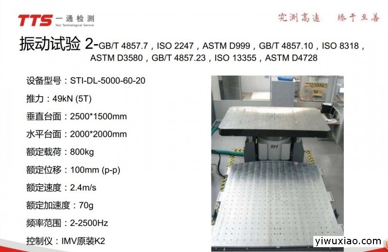 TTS检测拥有大型振动试验台:垂直台面:2500mm*1500mm,水平台面:2000mm*2000mm,最大位移:100mm.最大负载:800KG,最大速度:2.4m/s.频率范围:1-2000HZ。