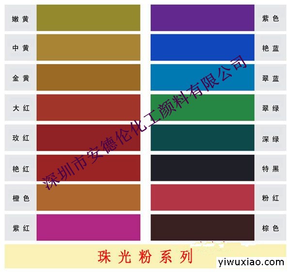 金色系列缎金色、皇室缎金、珍珠金黄、皇室金色、玛雅金阿兹特克金、古典金明亮金色、阳光金色、闪烁金色、绿口青金、红光金色、奥林匹克金等150目,200目,400目,800目。默克金黄珠光粉幻彩着色系列耐候性好,反射色紫色、红色、蓝色、绿色,透色色黄绿色、绿色、橙色、淡红色,明亮柔和的珍珠光泽。云母铁明亮的金属光泽及青铜色,极好的遮盖力.颜色可分为:青铜缎,红棕缎,葡萄酒红缎,紫红缎,青铜,红棕,葡萄酒红,紫红,咖啡色,闪光青铜,闪光红棕,闪光葡萄酒,闪光紫红等。虹彩珠光粉:金红石型,反射色金黄、红色、紫色、蓝色、红色,透射色淡紫色、淡绿色、黄绿色、淡黄色、淡红色等。明亮、闪光、柔和的珍珠光泽,耐候性好。