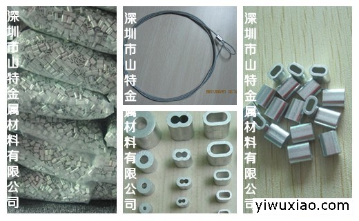钢丝锁紧铝管(8字形 椭圆形 圆柱形),我公司同时供应:8字形铝锁扣,椭圆型铝锁扣,圆柱形铝锁扣(O形铝锁扣),我司有专业团队生产铝扣,铝套,压制钢丝绳铝锁扣特点不开裂,使用寿命长,深圳市山特金属材料有限公司(SANTK)是金属材料、不锈钢材料、铝套、不锈钢索具的专业供应商,深圳市山特金属材料有限公司位于深圳市宝安区,目前公司销售的产品有:不锈钢板带,不锈钢线棒,不锈钢管,不锈钢丝绳,不锈钢弹簧扣,不锈钢登山扣,不锈钢链接环,不锈钢花兰,不锈钢夹头,不锈钢卸扣,不锈钢带圈弹簧钩,不锈钢弹簧钩,不锈钢链接环,【铝扣,8字形铝锁扣,椭圆形铝锁扣,圆形铝锁扣,铜锁扣,不锈钢锁扣】等。立足诚信,携手并进、我们期待与您的合作!联系电话:0755-81448725/0755-81448825