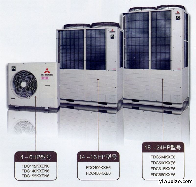 三菱重工'K'标中央空调原装进口系列单模块室外机规格包括4~6p,1416p,1824p,室内机有四向内嵌顶式、内藏风管式等13款93种规格。