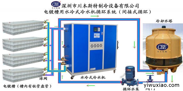 在电镀业,冷水机有助把金属与非金属离子稳定下来,使金属离子迅速附上电镀件,不但增加密度及平滑,并可减少电镀次数,提高生产率。在电镀业,冷水机有助迅速回收各种化学品,减少浪费, 电镀冷水机在普通冷水机上加装防腐蚀蒸发器,不锈钢管道,不锈钢泵或采用板式交换器。