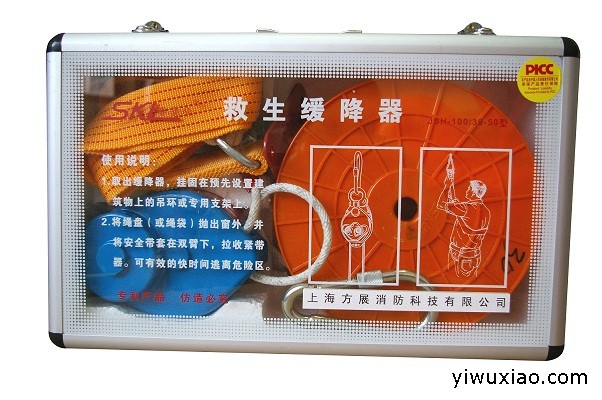 救生缓降器,普通缓降器,豪华缓降器,由挂钩(或吊环)、吊带、绳索及速度控制等组成,是一种可使人沿(随)绳(带)缓慢下降的安全营救装置。它可用专用安装器具安装在建筑物窗口、阳台或楼房平顶等处,也可安装在举高消防车上,营救处于高层建筑物火场上的受难人员。