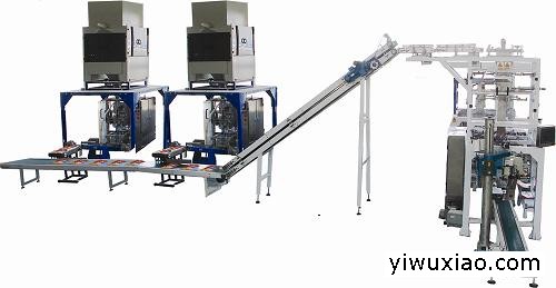 ◆生产流程:物料→一次包装机组→小袋产品→水平输送机→双层爬坡输送机→高速输送机→理包机→编织袋全自动包装机→全自动缝包机→编织袋产品输出。