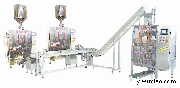 小包装机包装成的固体颗粒小袋或液体小袋产品通过输送生产线,提升机及整形设备,无序或者有序落入大包装机,通过大包装机整形或抽真空包装成袋中袋产品