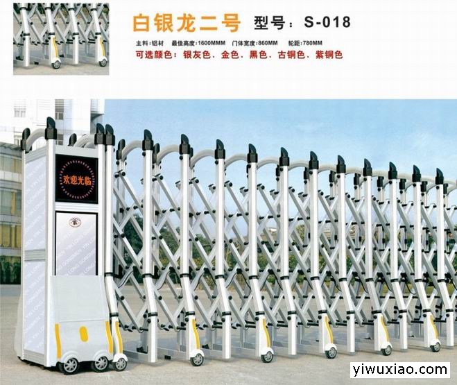 伸缩门产品结构:电动伸缩门主要有伸缩门体、机头、控制器三部分组成。1、伸缩门体:伸缩门体是由门体大框、交叉撑、轴(定轴、滑轴)及门体轮等主要部件组成。