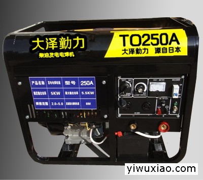 发电电焊机搭载世界著名的日本大泽发动机作为动力,采用独特的发电方式,发电效率高,电弧平滑,性能稳定,专业性强,能出色施行纤维素下向焊工艺,出色施行半自动焊接。设备仪表齐全,配有省油电磁阀、高低档电流选择开关、机油报警器等装置,重量轻,移动方便,特别适合于高、险、泽等环境下进行高质量焊接250A柴油发电电焊机,发电电焊机厂家,可以发电也可以电焊,另外还有5KW的辅助电源,是一款非常适合于野外焊接使用的机器,可焊直径2.5-5.0的焊条,可单独提供同等容量的单相电源,实现一机两用的功能,高效率电机,电压稳定,运行可靠,油耗低,可靠性强大容量油箱,有效保持12小长时连续工作,重量轻,体积小,可配有移动轮,为施工提供极大的便利汽油发电电焊机以汽油机为动力旋转发电,通过整流模块提供电焊用直流电。热线电话:021-60520814 手机18217734969 QQ 1292423463 企业网站http://www.daze666.com 欢迎广大客户前来咨询 型号:TO250A电焊机配置:电流调节范围:80-250A空载电压:65V工作电压:24-32V负载率:100%发电负载率:100%焊条直径:φ2.5-5.2发电机配置:额定功率:5KW大功率:6KW电压:220V频率:50HZ直流输出:12V/8.3A功率因数:1相数:单相励磁方式:AVR绝缘等级:F级动力配置:动力型号:DZ190F缸径:90*75mm冷却方式:风冷启动方式:手启动/电启动机油容积:1.65L机组参数油箱容积:25L连续工作时间:12H耗油量(G. KW.H):230供油方式:自流式尺寸:770*510*660(mm)重量:120KG