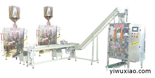 ????小包装机包装成的固体颗粒小袋或液体小袋产品通过输送生产线,提升机及整形设备,无序或者有序落入大包装机,通过大包装机整形或抽真空包装成袋中袋产品。