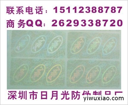 联系:陆先生  手机:15112388787  商务QQ号:2629338720     全国供应:数码标签、镭射揭开式电码标、防伪标、镭射标签、防伪标签、全息图、全息立体画、全息3D图、全息标签、全息贴纸、防伪包装、惠州数码标、深圳镭射标签、镭射激光标、全息标志、全息商标、全息不干胶、全息不干胶标签、全息图贴纸、全息图标志、全息图商标、全息图艺术品、全息图工艺品、全息画、广东全息工艺品、深圳全息工艺品、安徽全息立体画、日用品镭射标签、化妆品防伪标签、镭射防伪标、保键品防伪标贴、玩具防伪贴纸、激光标签,激光标贴,激光标志,激光标,镭射标,镭射标签,镭射标志,镭射商标,镭射标贴,镭射不干胶、激光镭射标,激光镭射防伪标,激光镭射标贴、、、  本公司防伪商标产品广泛适用于:服装皮具吊卡吊牌、饮料食品、白酒、葡 萄酒、红酒等酒、电子电器、 化工、化妆品、生活用品、玩具、礼 品、文化出版制品、汽配、摩配、特色农产品等等......(产品价格只做参考,具体以实样为准)本公司拥有美国的电脑光刻像素制版系统及激光全息生产设备,电脑密码防伪系统及电码防伪标识制作技术。汇集先进的设备和科技人才为一体,提供以图案设计到激光制版、模压、涂布、模切、质量检验及包装运输全系列,全封闭优质服务保证产品质量和防伪安全。严谨的保密制度外,还为客户提供完整的售后服务。欢迎各位朋友业务洽谈!(网上价格仅供参考,实价欢迎来电咨询,谢谢!)每张防伪标签都是免费设计的,让客户都能有属于自己独一无二的防伪标签!