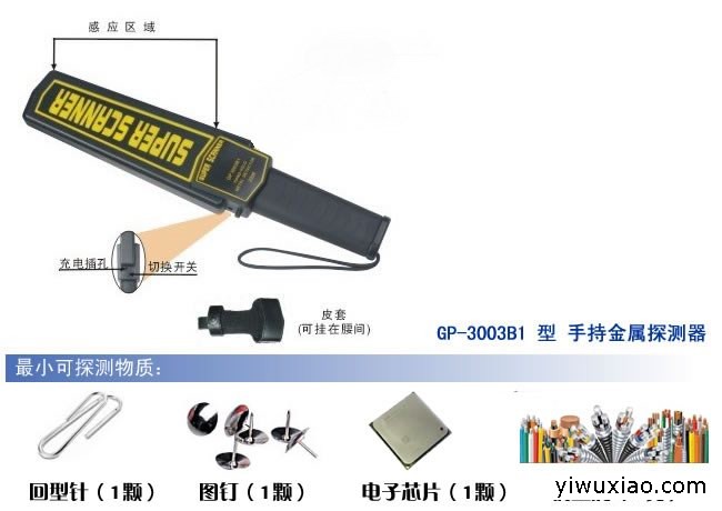 手持式高灵敏度金属探测器GP-3003B1 超高灵敏型多功能手持式金属探测器,是一款高性能专为安防设计的金属探测器。与传统探测器相比:探测区工作面的特殊设计,探测面积大、扫描速度快、灵敏度极高。外壳采用ABS工程塑料一次铸成,抗击能力强、工艺精细、重量轻便于携带等特点。可探测被隐藏在人体身上的所有种类的金属物体,包括小型刀具、箱形刀架、首饰,电器元器件等。适合在机场、海关、码头、银行、建筑、监狱、体育场、医院,学校考试等场所使用。适用范围:1.机场、法院、车站、考场、码头电子探测检查2.海关、监狱、边防、保卫部门安全检查3.医药、服装、食品、商业系统质量检查4.教育考试、娱乐场所、展会展馆、运动场等安全安检检查5.贵金属检测,如金银首饰厂、珠宝厂技术特点:1.高灵敏度;操作简单、方便,说明书有中、英文版本自选。2.使用简单、方便,无须调整;人性设计,美观大方,灵敏度极高。3.9V电池降至7V左右,探测距离不变;4.用电省,可持续工作40小时以上;重量轻、检测探头面积大,探测速度快。5.电池用完时,有自动连续的告警声;6.有开机、关机声音提示功能;7.有外接充电插孔,充电器自配;8.有声光、振动切换开关。9.标准是GB 12899--2003《手持式金属探测器技术条件》的修订版技术参数:1.外形尺寸:415(长)*85(宽)*45(高)mm2.工作电源:标准9V叠层碱性电池3.密封性能:IP644.报警模式:声光同步报警/振动报警5.产品重量:净重:340g 毛重:440g6.装箱包装尺寸:50*28*45cm(25支/箱,13.5KG/箱)6.工作温度:—5度—55度最高探测距离:一般 : 25 cm 小型工具: 35 cm 一枚银元: 20 cm 大头针: 10CM性能及特点:配备皮套,方便个人携带具备充电功能(直充或座充),充电时间为4-6小时(充电器和充电电池另购)当电压不够时,指示灯不亮或无报警声声光(震动)自动切换报警,可根据情况选择在使用低灵敏度开关功能时,探测器只会对大件金属物品发出报警,而不会对小金属物品不报警(在完成低灵敏度探测前请不要松开该开关)售后服务:凡我厂购之金属探测器产品一个月包换,一年包修,终生包维护。