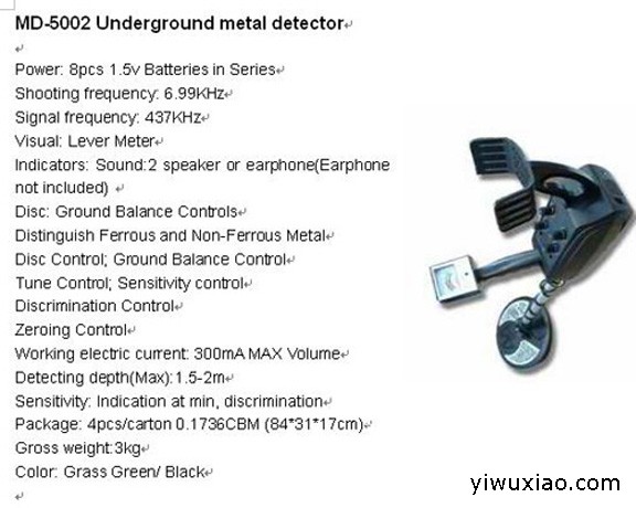 专业从事以研发、生产、销售金属探测器,地下金属探测器,安检门,金属探测门,安检探测器。广泛应用于车站安检,考场、法院,海关,机场安全检查;针织,纺织,服装,电子五金防盗;网吧,酒吧,KTV,迪厅携带禁止品入场,防暴未然;挖掘地下黄金,银元,可探测地下铁,铜,金,银、矿藏识别等等。 售后服务: 选择厂家,有价格优势!选择我们,有质量保证:本公司所售出的产品七天内有产品经厂家检测存在本身质量问题、产品规格、外观包装与消费者要求不符等问题,允许消费者无条件更换或退货.一年包修,终生维护. 地下金属探测器均采用国际上先进技术设计,且采用世界上优质的元器件制成。深度深、定位准确。分辨力强、操作简单。主要用于探测和识别隐埋在地下的金属物。 用途:1.废旧收购2.侦破搜查3.考古,发现埋藏在地下的金属文物和金银宝物4.检查地下管道、电线、电缆。是建筑施工、自来水装修、供变电、城市改建等作业中必不可少工具5.探矿,可探各种金属矿物,且对某些高品位的矿,尤其对自然金块更为有效 使用特点:地平衡:能有效排除大地矿化反应,较佳的穿透能力识别:能区分有色金属和黑色金属。MD-5002手持式金属探测器对金、银、铁、锡……等一切金属都能探测,而对覆盖在这些金属之上的泥土、陶瓷、岩石、塑料、水泥、木材等物质都能穿透。MD-5002手持式金属探测器,是一种手持式仪器,可以随身携带,有探头。 操作方式:地平衡/识别 本产品采用声音报警及仪表显示,探测深度跟被探金属的面积、形状、重量都有很大的关系,一般来说,面积越大,数量越多,相应的探测深度也越大;反之,面积越小,数量越少,相应的深度就越小。下表所列最大探测深度,是按产品的企业标准用一块60公分*60公分*0.5公分的铝板埋入干燥泥土之中实测的结果!参数:实验最大探测深度:1.5米—2.00米 电源:DC 12V(8节AA 1.5V电池)信号频率:437KHz发射频率:6.99KHz工作温度:-10℃~+55℃ 重量:3.2kg操作方式:地平衡/识别