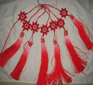 中国结,流苏吊穗,汽车挂件属于手工艺品,采用上等尼绒线制作而成,颜色以鲜红色为主、款式多种多样,适合家庭、宾馆、酒店、汽车等装饰使用。可来样订做,装箱规格:散装,外箱尺寸可按客户要求大小。中国手工艺品让你换一个视角,去审视生活、去感受人生、去观赏一种美,有时得到的是完全意想不到的奇妙结果。这是大自然与人类交融的多样性,还是它们相互作用的独特性?总之,因了这个视角的转换,生活、人生、美,瞬间便丰富起来,借此而传导出来的,也便是更有吸引力和文化色彩的内涵。不仅造型优美、色彩多样,同时作品的命名,如“吉庆有余”、“福寿双全”、“双喜临门”、“吉祥如意”、“一路风顺”出等组配,都表示热烈浓郁的美好祝福,是赞颂以及传达衷心至诚的祈求和心愿的佳作。中国结从头到尾都是用一根丝线编结而成,每一个基本结又根据其形、意命名。把不同的结饰互相结合在一起,或用其它具有吉祥图案的饰物搭配组合,就形成了造型独特、绚丽多彩、寓意深刻、内涵丰富的中国传统吉祥装饰物品。中国结与现代生活相结合,已发展成为多个产品,其中主要有两大系列:吉祥挂饰和编结服饰。每个系列又包括多个品种,如吉祥挂饰有:大型壁挂、室内挂件、汽车挂件等;编结服饰有:戒指、耳坠、手链、项链、腰带、古典盘扣等。材料是红线,线的种类很多,包括丝、棉、麻、尼龙、混纺等等,都可用来编结,究竟要采用哪一种线,得看要编哪一种结,以及结要做何用途而定。一般来讲,编结的线纹路愈简单愈好,一条纹路复杂的线,虽然未编以前看来很美观,但是取来编中国结,在一般情况下,不但结的纹式尽被吞没 ,而且线的本身具有的美感也会因结子线条的干扰而失色。 线的硬度要适中,如果太硬,不但在编结时操作不便,结形也不易把握; 如果太软,编出的结形不挺拔,输廓不显著,棱角不突出,但是扇子 、风玲等具有动感的器物下面的结子,则宜采用质地较软的线,使结与 器物能合而为一,在摇曳中具有动态的韵律美