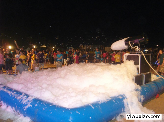 泡沫机通常用在泡沫派对上,泡沫在前几个小时只是暖暖身,是不会淹没你的脖子的。等音乐、灯光把大家调动到最High的时候,泡沫机大炮将启动。突然,大量的泡沫像最猛烈的雪花从天而降,覆盖到人的身上,霎时所有的人被泡沫满头满脸地给埋了起来,如果是在酒吧里,就算是在二楼,冲射时高达8米的泡沫浪花也不能幸免啦!泡沫从一个边到一个边缓缓的累积覆盖直到将舞池装填到大约5 只脚深,到了泡沫派对的最后,地板上将堆积一只脚厚的泡泡,有些人就会在地板上滚来滚去. 每次喷洒的泡沫也不一样,有一些是相当轻而蓬松的泡沫,落在身上象雪花,有些则比较厚实,有点被水泼到的感觉,留在身上也会更长一些.